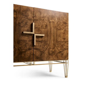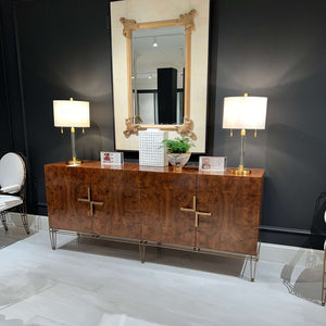 Crafted from rich walnut burl veneers, this sideboard showcases the beauty of natural wood patterns. The stainless-steel exoskeleton base exudes modern sophistication, offering a sturdy foundation that complements the wood's warmth.