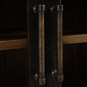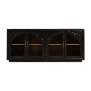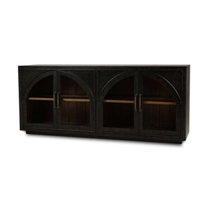 Add a touch of elegance to your home with this stunning French Modern Industrial Sideboard. Crafted with mahogany and finished in a lightly distressed Vintage black, this 78" long sideboard features unique glass doors with arched detailing, creating a perfect blend of rustic charm and contemporary style.