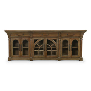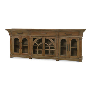 Constructed with solid mahogany and finished in our medium straw wash, it features intricate arch designs on the glass doors, exuding a sense of classic charm and sophistication. The crowned frieze houses three spacious drawers, sitting atop six glass-paned cupboard doors. The interior shelving offers ample storage, allowing for a stylish display of your favorite items while keeping them protected.