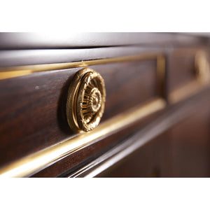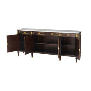 Louis XVI Style French Buffet, Inspired by a favorite French antique buffet sideboard. Bianco Carrara marble top with sculpted corners. Fluted column uprights detailed with cotton-reel cast capitals. Door/drawer fronts adorned with cast brass handles and molding. Turned and fluted tapering legs with brass cappings. Mahogany solid and Crown veneer.