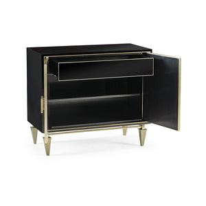The stainless steel base and hardware are cast in our exclusive foundry and finished in a light champagne patina, adding a touch of understated opulence. Behind the two stainless steel-framed églomisé doors, you'll find a thoughtfully designed interior featuring one spacious drawer and a shelf for discreet yet accessible storage.