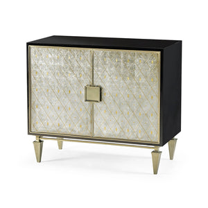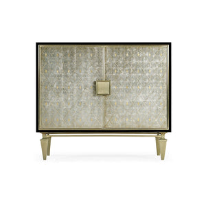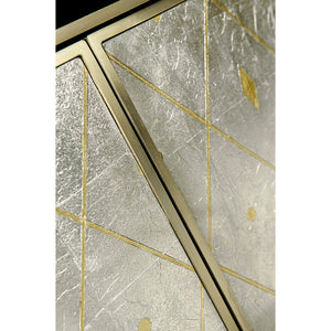 Elevate your interior with the Mid Century Accent Cabinet, a masterful blend of timeless elegance and modern sophistication. Inspired by classic French églomisé, its striking doors are adorned with antiqued gold and silver leaf in a traditional harlequin pattern, creating a luminous statement piece.