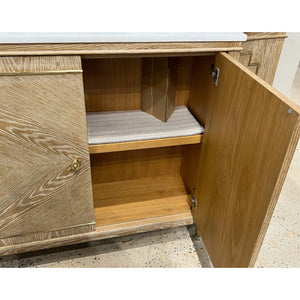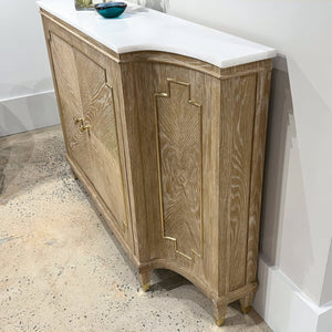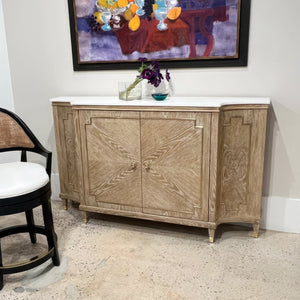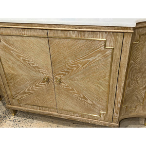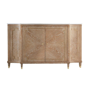 The Mid Century Oak Sideboard transforms premium oak veneers into a striking sunburst pattern across its facade. The light cerused finish highlights the wood's natural grain, while geometric panel details and brass accents add architectural sophistication. A luxurious white marble top crowns the piece, creating a perfect balance of durability and style.