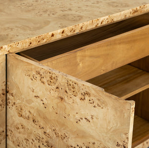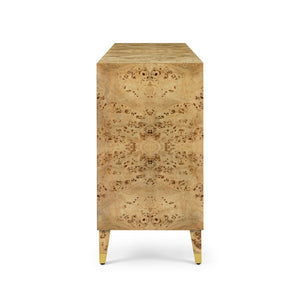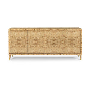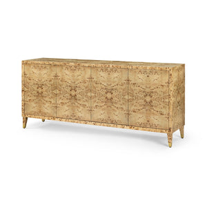 The Modern Clear Burl Buffet Sideboard combines contemporary design with timeless craftsmanship. Featuring four burlwood doors framed by a beveled edge, this sideboard exudes understated elegance.
