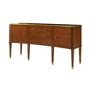 Solid brass detailing adds a luxurious touch, from the drawer pulls to the elegantly tapered legs with brass-capped feet. Featuring three spacious drawers and two side cabinets, this sideboard offers ample storage for fine dining essentials or treasured décor pieces. Whether placed in a dining room, living space, or grand entryway, the Modern Walnut Sideboard is an exquisite statement of style and function.