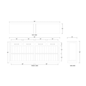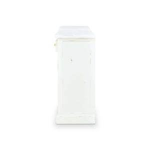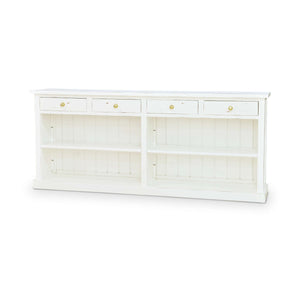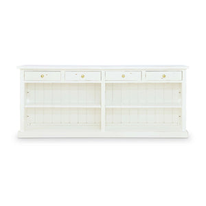 Built with solid mahogany and hand-finished in our distressed White Harvest finish, this buffet features a rectangular top above four frieze drawers and an open space with adjustable shelves. The open design offers versatile storage options while maintaining an elegant, coastal-inspired aesthetic.