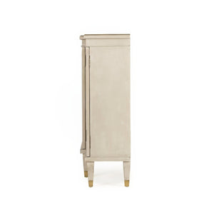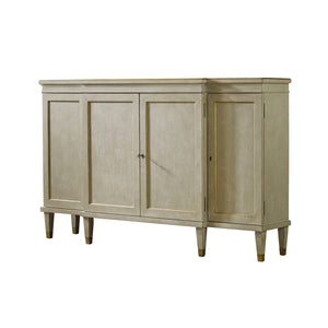 With four doors that open to interior storage space each with an adjustable shelf. The elevated design on tapered legs creates an airy presence, making it a versatile addition to formal dining rooms, entryways, or living spaces where classical sophistication is desired.