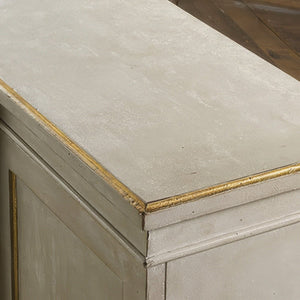 The Regency Antiqued Gray Painted Credenza combines sophisticated style with delicate gilt accents that highlight its classical architectural details. The antiqued grey painted finish is applied to the breakfront form cabinet.