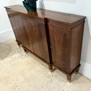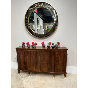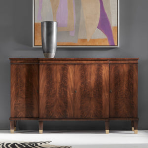 The Regency Walnut Credenza showcases the natural beauty of hand-rubbed figured walnut in a classic breakfront form. The expertly bookmatched veneer creates a classic pattern across all four doors reflecting traditional antique design elements. Polished brass feet and discreet hardware complement the walnut's rich, warm tones.