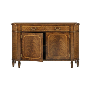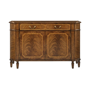 The Traditional English Small Sideboard showcases a perfect balance of classic design and artisanal detail. A magnificent figured swirl wood draws the eye across its stepped top and two-door cabinet body, emphasizing the depth and richness of its handcrafted veneer work. Inlaid paneling, elegant shaping, and subtle fluting highlight the fine English Regency inspiration.