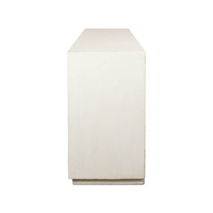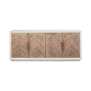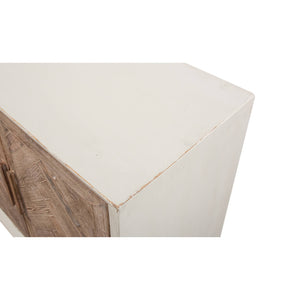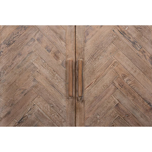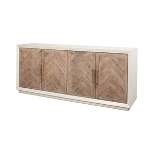 Elevate your home with the White Chevron Reclaimed Wood Buffet Cabinet, a symphony of texture and timeless design. This cabinet showcases the natural allure of reclaimed pine, finished by hand in a nuanced antique white that tells of whispered elegance and earthy charm. Its doors, graced with a chevron pattern, open to a world where your treasures are kept safe and sound.