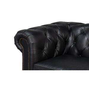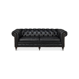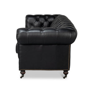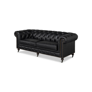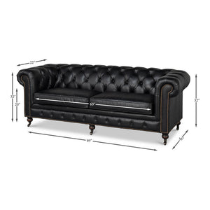 Black Chesterfield Sofa, a vintage style classic English Chesterfield leather upholstered sofa, with top-grain leather. With a tufted backrest and rollover arms, and two padded cushions raised on turned mahogany feet with brass casters and finished with brass nailhead trim.