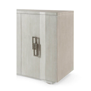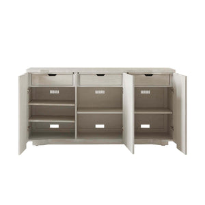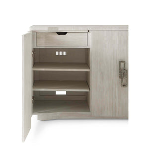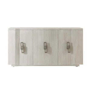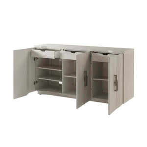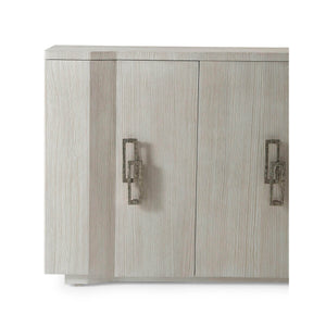 Coastal Breeze Buffet, is a finely crafted cabinet built using wire-brushed cerused pine with a 45º beveled profile and accented by interlocking chain link hardware in our sea salt finish.