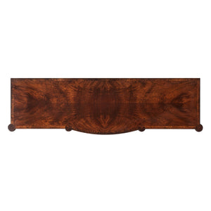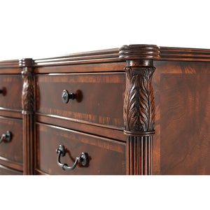 A mahogany and figured mahogany veneered dresser, the reeded edge top with protruding corners and a central bowfront with leaf carved and reeded uprights with three frieze drawers and nine further graduated and crossbanded drawers with verdigris brass handles, raised on turned legs. Inspired by a Federal Period original.