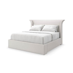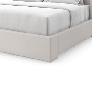 Flared Modern Fully Upholstered Queen Bed - Light, an elegant US queen-sized upholstered bed frame featuring a high headboard that is flared out and curves gently at the sides. The frame is wrapped in a light natural color fabric with a subtle textured finish, which suggests a contemporary design that could fit well with various bedroom decor styles.