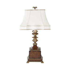 A French Louis XVI style pollard burl and finely cast brass table lamp, the twin light arms above a shaped base with brass mounts surmounted by hand-sewn silk shade.