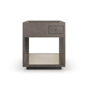Mid Century Cube End Table, an alluring mix of materials and finishes elevates this end table, featuring a simple square shape and open space for storage and display. An antique mirrored top and shelf creates a sense of depth and warm reflection, complemented by an overall broken leaf finish for tactile appeal and added shimmer. A single, asymmetrical drawer with recessed finger pulls offers a tucked-away place for minimizing clutter.