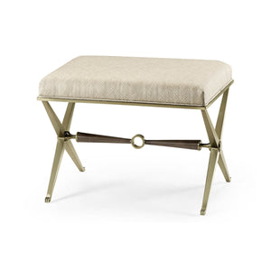 Mid Century X Stool, inspired by traditional Spanish ironwork, the base is fabricated from steel and finished in a light, champagne patina. The box cushion seat is upholstered in a performance fabric.
