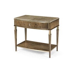 The top of the nightstands feature a figured Spanish marble that adds a touch of elegance and sophistication to the overall design. The drawer fronts feature a walnut swirl veneer with a transparent, low-luster finish that not only enhances the beauty of the wood but also adds to its durability.