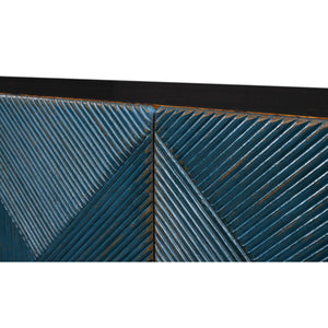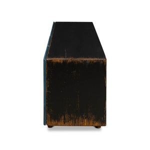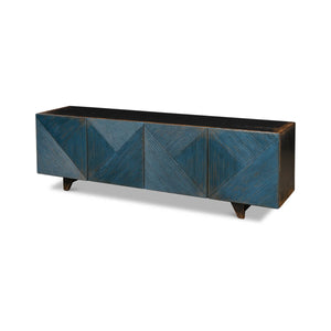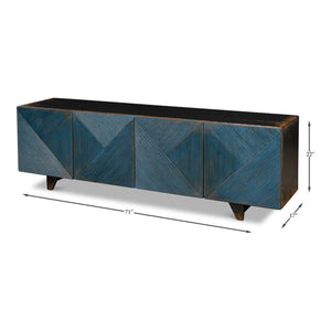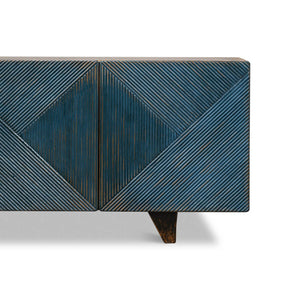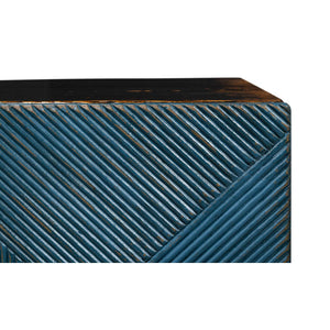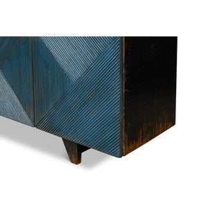 Modern Rustic Painted Media Cabinet, made with reclaimed pine in a dark blue wash finish. The door panels with reeded geometric designs, with a dark brown pine top and side. With an antiqued rustic painted finish.