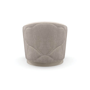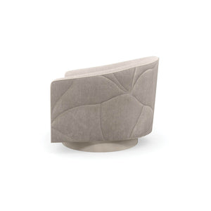 Organic Modern Swivel Armchair, this softly curved swivel chair introduces a free-flowing, organic style to seating areas. A quilted ginkgo leaf pattern fanning out along the back creates repetition and subtle movement, accented by a cream-colored contrast welt and plinth base wrapped in pearl vinyl.