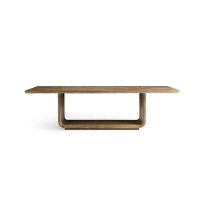 The 86" Rustic Modern Wood Dining Table stands out with its long rectangular top and sculptural U-shaped base, both featuring gently rounded corners. Made from warm-toned wood, the tabletop seems to float above the sturdy pedestal, balancing clean lines with a soft, natural feel. The visible wood grain and smooth edges show off the material’s character and give the table a strong, grounded look.