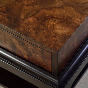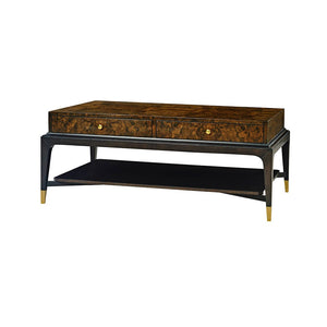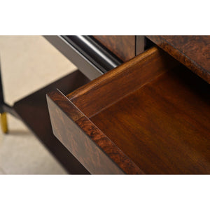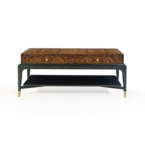 The Art Deco Burl Walnut Coffee Table anchors the room with refined glamour and sculptural presence. Its rectangular top, crafted in a natural walnut burl veneer, showcases intricate grain patterns that evoke timeless elegance. Four drawers are subtly integrated for storage, while round brass pulls add a hint of polished detail.