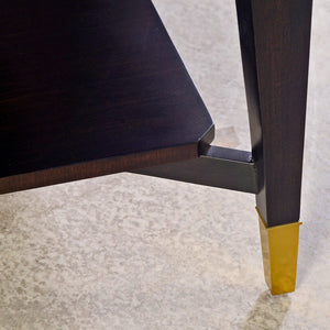 An espresso-finished base brings visual contrast, enhanced by tapered legs capped in brass for a sophisticated touch. The open lower shelf offers additional space for books or display. Ideal for modern and transitional interiors, this coffee table delivers statement style with everyday function.