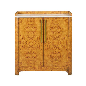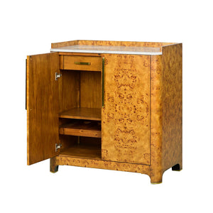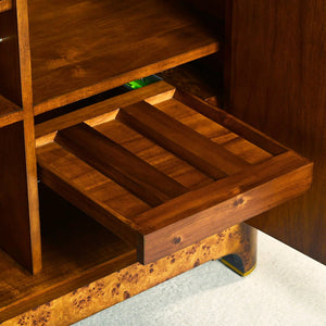 Open the two smooth doors with long brass rod pulls, revealing a meticulously designed interior. Two drawers offer discreet storage, while dedicated bottle storage and five open sections keep your collection well-displayed. It's not just a cabinet; it's a statement of refined taste.