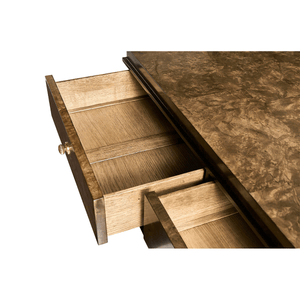 The piano black lacquer accents provide a striking contrast against the dyed brown burl veneer, creating a visual harmony that captivates the eye. This contrast of materials adds depth and drama, making the chest a work of art.