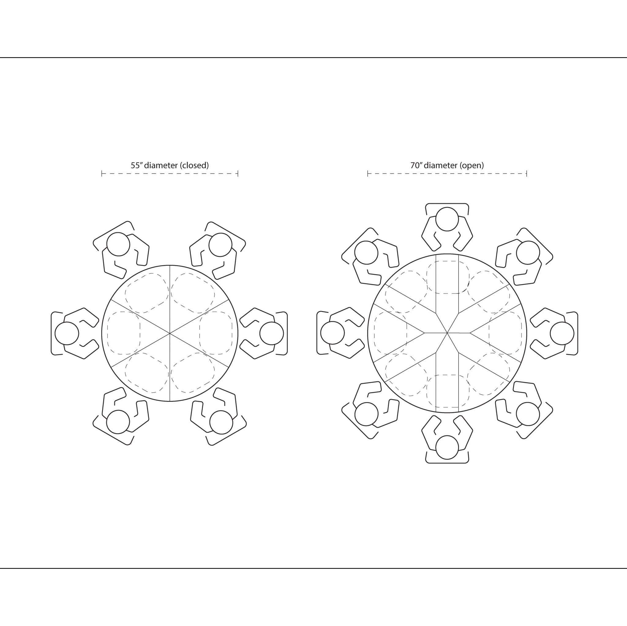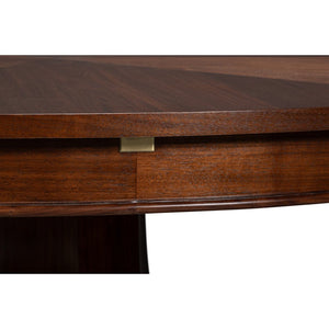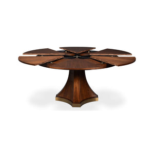 A subtly flared pedestal anchors the design, finished with an understated brass trim that adds a refined touch of glamour. The table smoothly transitions from an intimate round profile to a larger dining surface, making it ideal for both daily use and elevated entertaining. Its blend of premium materials, thoughtful detailing, and expanding Jupe mechanism makes this piece a standout focal point for dining rooms seeking timeless elegance.