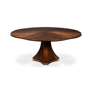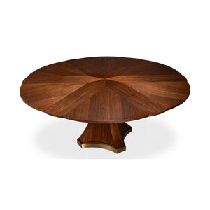 The Art Deco Style Walnut Jupe Dining Table showcases a striking sunburst walnut veneer that radiates elegantly from the center, creating a sense of movement and symmetry. Its warm, richly toned surface draws from classic Art Deco geometry, while the table’s expanding circular form enhances both function and visual appeal. The sculptural pedestal base introduces a Mid-Century influence, balancing vintage sophistication with contemporary craftsmanship.