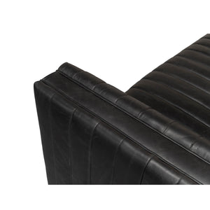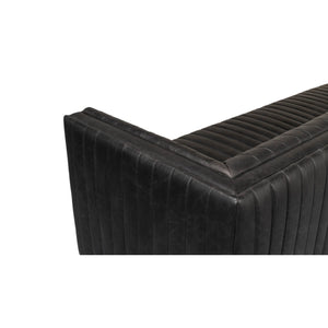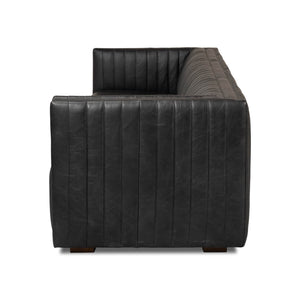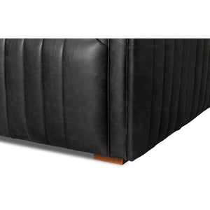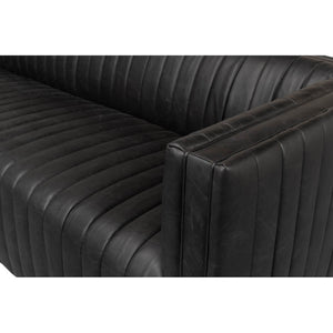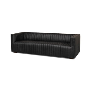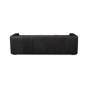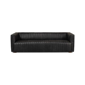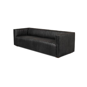 Black Leather Mid Century Sofa with a maple frame and black top grain leather. The eloquent sofa has a unique modern channeled leather design to the backrest, seat, arms and rear.