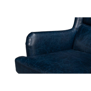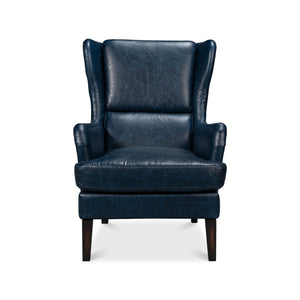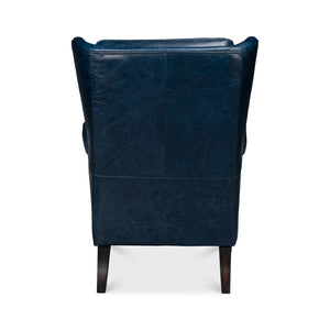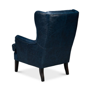 Classic Wingback Leather Chair Chateau Blue, with the Chateau Blue traditional top grain Vintage style leather, with high classic wingback backrest and boxed cushion seat raised on tapered legs.