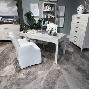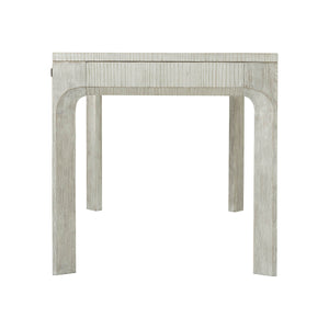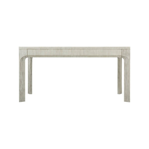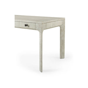Coastal Breeze Desk, handcrafted wire-brushed cerused pine in a light and subdued Sea Salt finish, the desk displays three functional drawers with organic ribbed metal knobs in our Dark Sterling finish and a beveled-shaped cross-section.