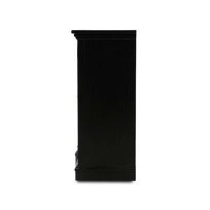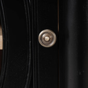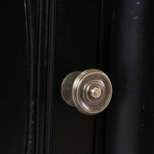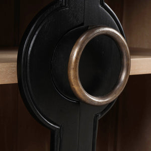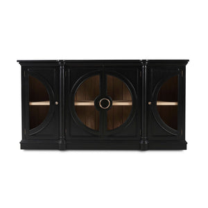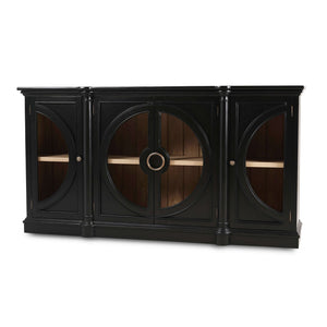 Crafted from solid mahogany and finished in our Batavia Black, the credenza features beautiful circular glass-paneled doors that add a touch of elegance and intrigue. The spacious interior, finished in a complementary sandbar hue, offers ample storage space to keep your essentials organized. The warm interior wood finish also adds a layer of rustic sophistication, creating a perfect balance between modern chic and classic design.