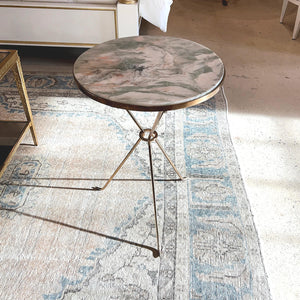 This French Art Deco Style Accent Table exudes elegance with its stunning design that features a round onyx inset top and delicate brass three-leg bound base. Its classic French Art Deco style takes us back to the glamorous 1930s, evoking images of opulent and luxurious living.