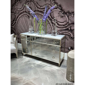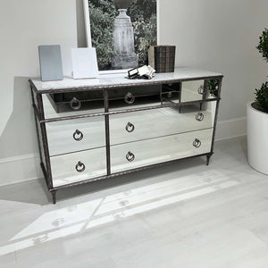 Atop sits a durable Carrara white marble, renowned for its pristine beauty and robustness, which complements the dresser's mirrored exterior and adds a touch of timeless elegance. The six spacious drawers, equipped with undermount soft-close drawer guides, ensure seamless and quiet operation, fully finished in a luxurious Crème De La Crème to offer a soft textural contrast.