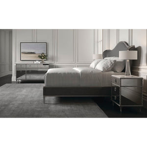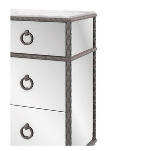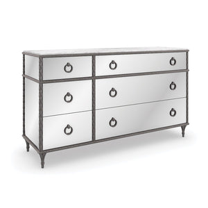 The dresser features mirrored front and end panels, creating a dazzling reflective surface that enhances the light and space in any room. The cast aluminum legs and cast molding are exquisitely finished in smoke leaf gray, highlighting richly carved laurel leaf motifs that pay homage to classic Baroque design.