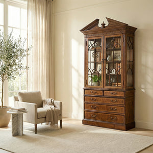 The George II Walnut Bookcase is a fine example of English revival design, blending elegant architecture with useful storage. Made from warm hardwood with walnut veneer and crossbanded details, its tall, balanced shape shows classic Georgian style. The pointed-arch tracery in the glass doors brings in a touch of Gothic Revival. A broken pediment with a central urn finial gives it a sculptural look and a strong, vertical presence that fits well in formal rooms.