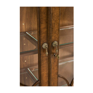 The upper cabinet has three glass shelves, perfect for showing off books, porcelain, or collectibles. Built-in lighting with a touch dimmer softly lights up your display. Below, the lower section has two small drawers and three larger ones, all with classic brass handles, offering plenty of hidden storage. This piece works as both a display cabinet and a secretary, making it a versatile and elegant addition to any library or formal space.