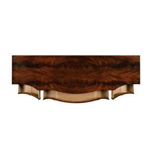 Substantial George III style bow fronted serpentine sideboard with four doors, flame mahogany veneers, and three drawers to the upper register. Contrasting stringing throughout and raised on square cross-section feet.