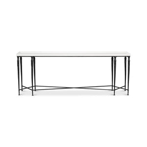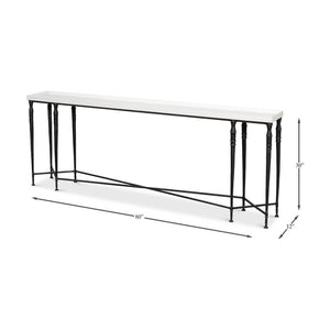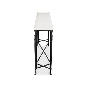 Large Art Deco Console Table is a striking blend of minimalist design and classic detailing. This table features a smooth, off-white wooden dishtop that sits atop a slender black iron frame.