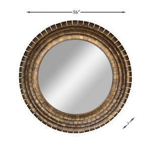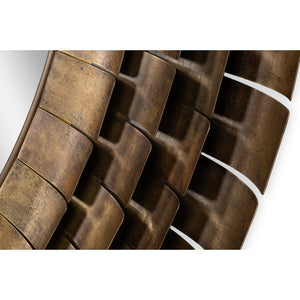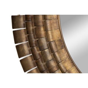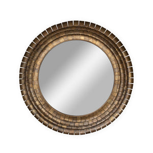 The Large Round French Art Deco Mirror brings sculptural sophistication to any space with its bold, tiered frame constructed from concentric, brick-like segments. Finished in a warm, distressed gold tone, the stratified brass plate surface reflects the glamour and symmetry of classic Art Deco design while maintaining a contemporary, architectural presence. Its circular silhouette anchors the dramatic texture, creating a refined focal point suitable for both modern and vintage-inspired interiors.