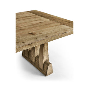 Large Rustic Oak Dining Table with Arched Pedestal Base. Crafted from solid wood, this expansive rectangular table features a sculptural double pedestal design with three graceful arches on each side, giving the piece architectural character and visual depth. The broad fixed top highlights the natural oak grain, showcasing fine craftsmanship and sturdy construction.