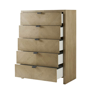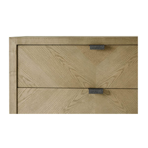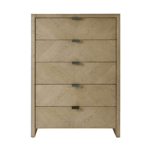 Light Ash Tall Chest, a handsome five-drawer tall bedroom chest made of figured ash in light Dune finish with textured metal pulls in our Ember finish and soft close drawers.