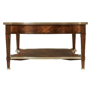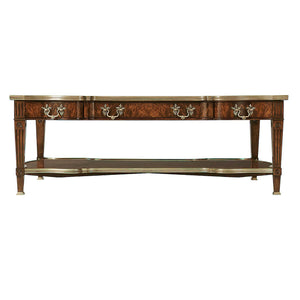 A flame mahogany veneer and solid cocktail table, the serpentine brass bound top above two drawers on each side centered by a leather inset slide drawer with a concealed drawer, all with brass Rocaille handles, on square tapering, fluted legs joined by a serpentine brass bound under tier.