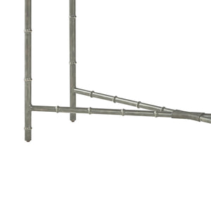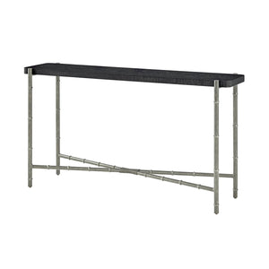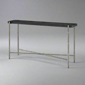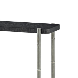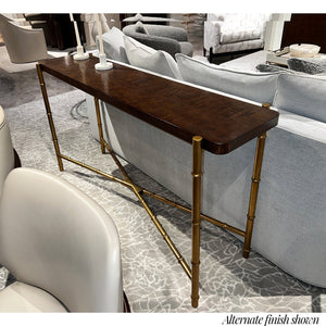 Elevate your interior design with the Mid Century Burl Top Console Table, a perfect fusion of timeless elegance and modern sophistication. The exquisite Tamo ash burl wood top, featuring unique grain patterns and finished in a dark Silent Black, brings a touch of natural beauty, while the Brass bamboo-inspired base adds a hint of opulence.