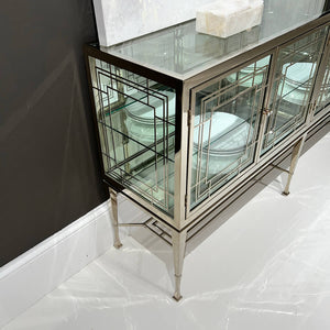 Mid Century Glass Sideboard, as glamorous as gold jewelry sparkling in the light, this brilliant glass sideboard reflects beauty from every angle. It’s crafted of clear glass panels and features a glass top, glass end panels, glass shelf and four clear glass doors — all gleamingly reflected in its mirrored back and bottom panels. An elegant Whisper of Gold finish envelops its plated metal frame, adding contrast to its surface. It's the perfect piece for displaying favorite treasures and collections.