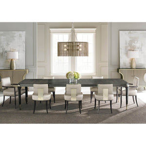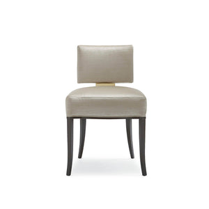 Mid Century Klismos Dining Chair, for a fresh interpretation on a low, modern klismos chair, this silhouette takes on dramatic style when you view the wide, Whisper of Gold panel that shines off its back. A neutral sateen fabric with a subtle moire pattern fully surrounds the square upper back and seat cushion that rests on an exposed wood frame and sabre legs finished in Seal Skin.